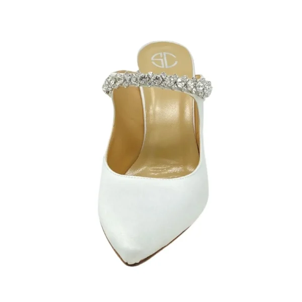 Scarpe col tacco raso bianco made in italy con magnifico accessorio di strass su collo piede